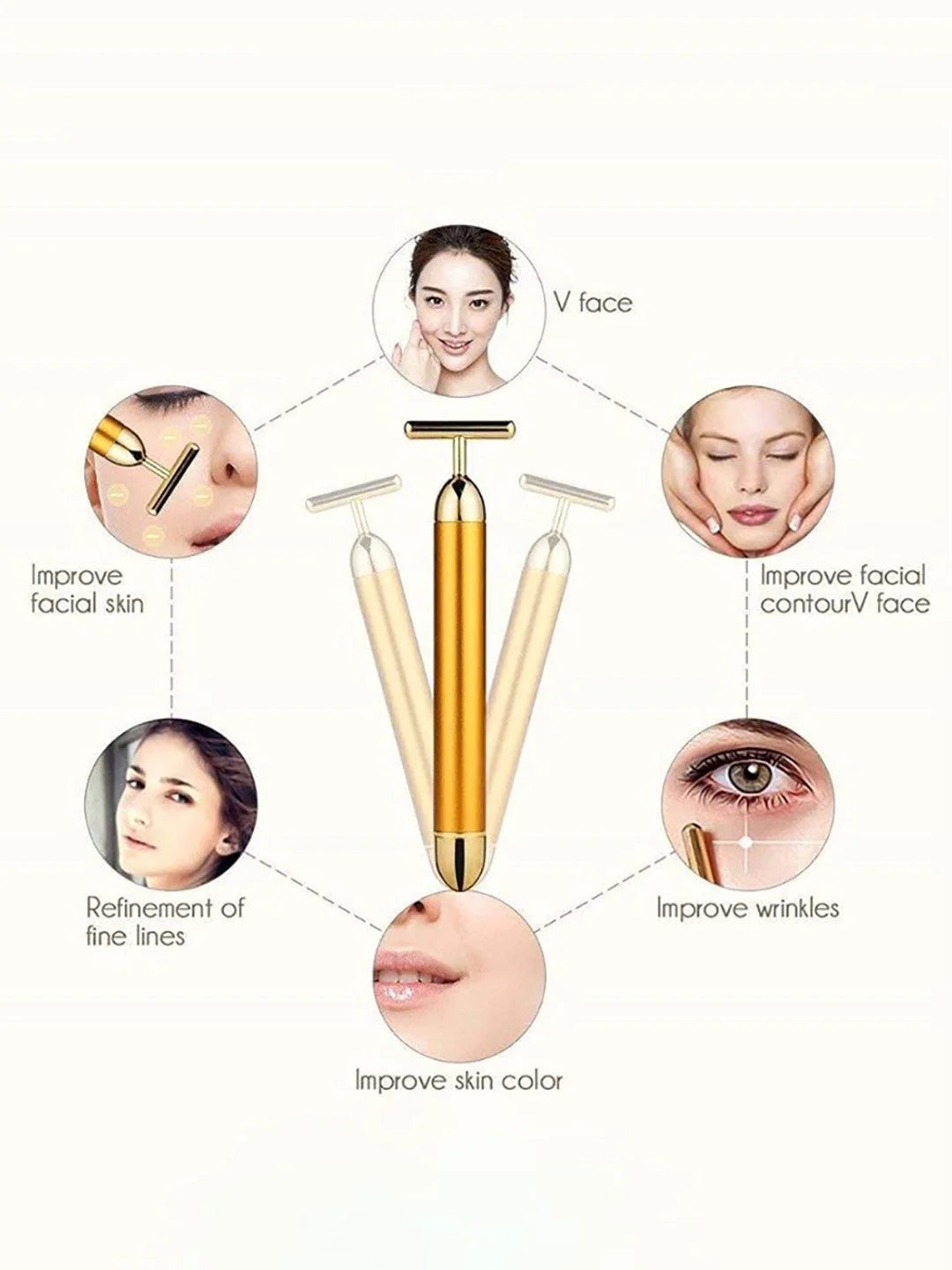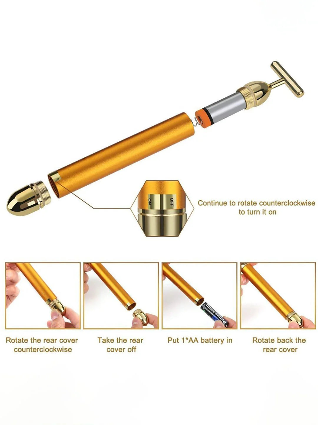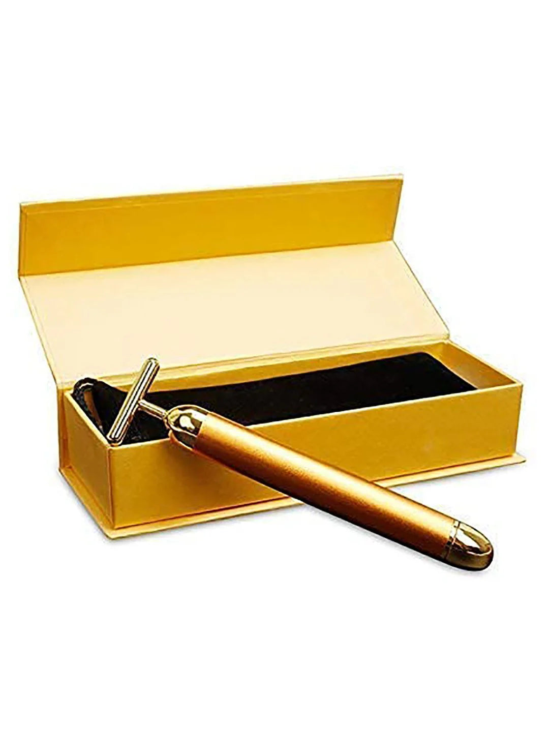 Product Name: 24K Gold Energy Beauty Bar Electric Facial Massage Roller Package Contains: It Contains 1 Pack Of 24K Gold Energy Beauty Bar Electric Facial Massage Roller Color: Gold Combo: Pack of 1 Ideal for: Women Usage/ Benefits: T-Shaped head :adds mild Shaking to push and patting face skin and therapeutic point. Relax facial muscles Facial Beauty Massage Bar: Lift your face, tighten and revitalize your facial skin. Used with uplifting, super hydrating, anti-oxidant & anti-wrinkle products for better results. Safe Material: Mainly made up of brass and aluminum, T type head part is 24k gold special surface finish, an anti-bacterial material which is safe for you skin. Waterproof Structure: Can use in bathroom. Reshape your face contour to reveal your youthful energy. Weight: 400