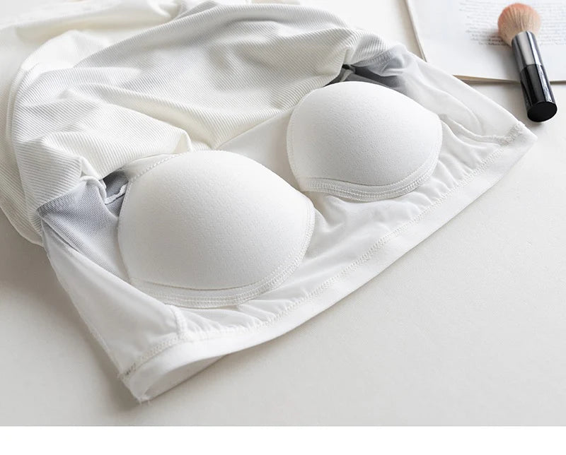 Discover the convenience and comfort of our bra T-shirt with built-in padding. Made from soft, skin-friendly cotton, it offers a snug fit with an elastic band and integrated chest pads.